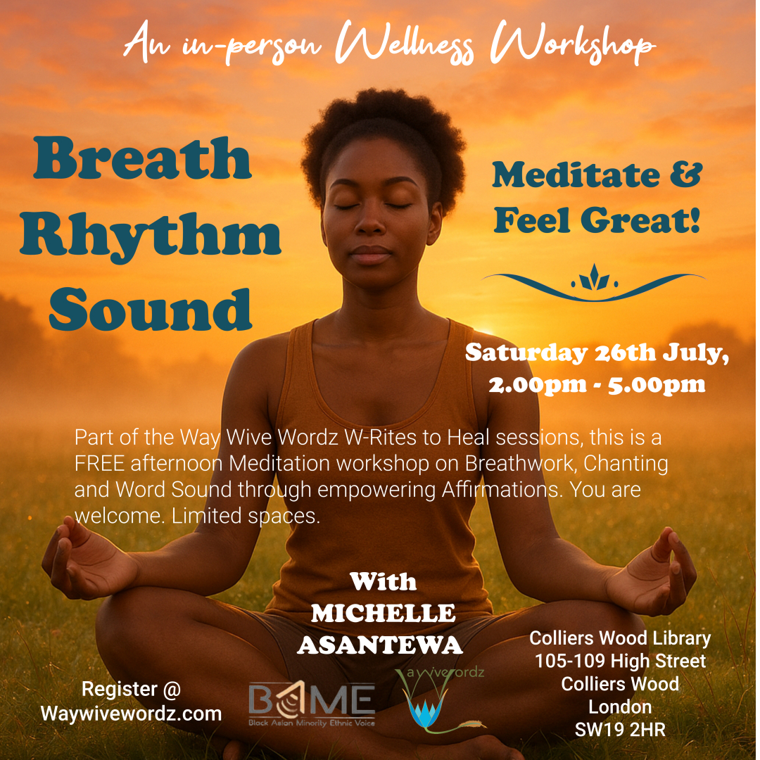Part of the Way Wive Wordz W-Rites to Heal sessions, this is a FREE afternoon Meditation workshop on Breathwork, Chanting and Word Sound through empowering Affirmations. You are welcome. Limited spaces, and priority given to students attending the 4-week W-Rites to Heal abridged course.