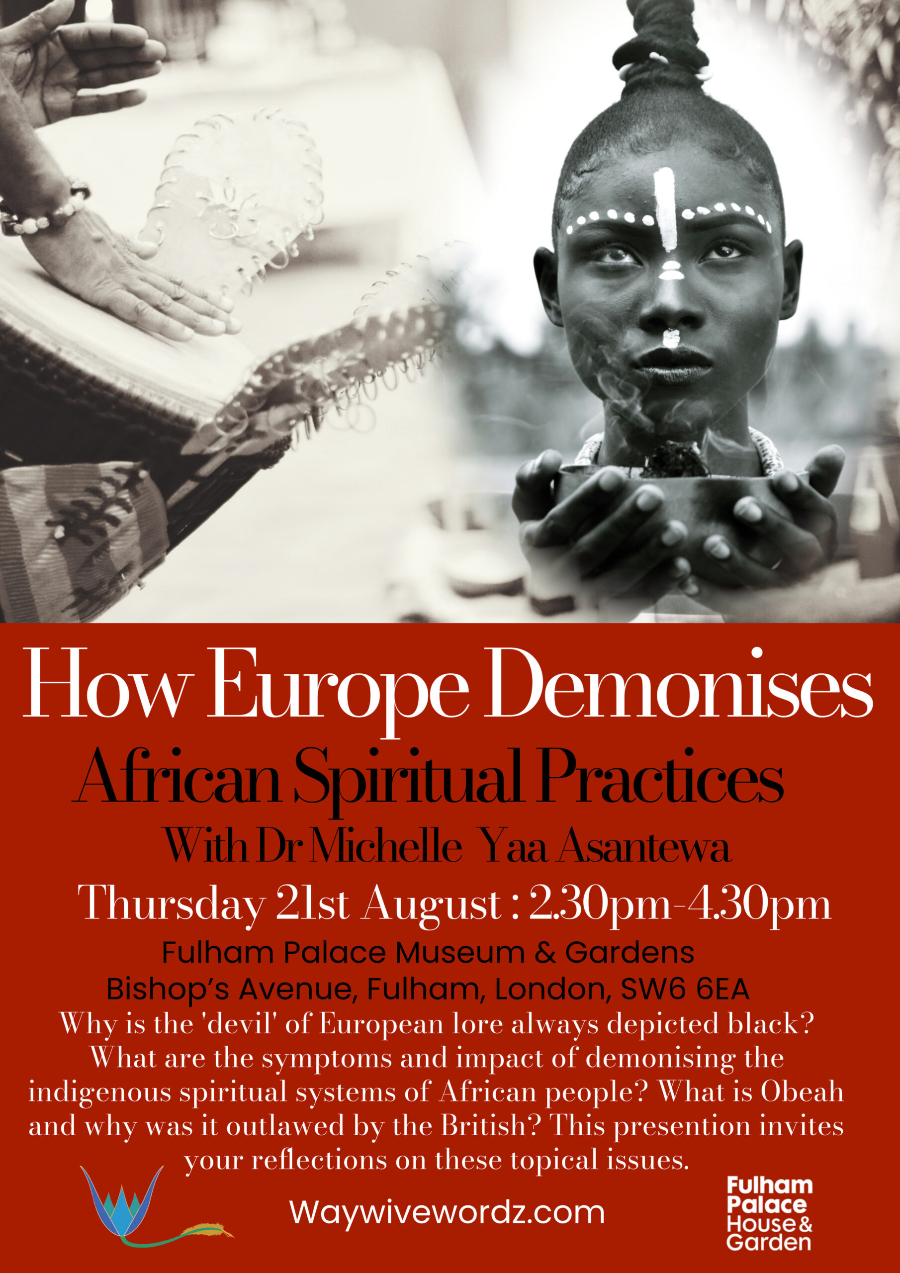 While perceptions and representations are changing, there is still a lot of negative expressions and ideas about African spiritual practices. The recent success of Ryan Coogler’s Sinners ignited hot discussions about African spirituality versus Western Christianity, and which was dominant in attempting to resist the invasion of vampires. The film highlighted how little is known about the varied spiritual practices that connect Africans across the continent and in the diaspora, while drawing deeper interest in these traditions. We will explore some of the reasons why African spiritual practices  are often misrepresented, considered demonic and negative, especially when viewed through a Western European lens. This presentation is a collaboration between Way Wive Wordz  and Fulham Palace Museum, and provides a link with the exhibition – The Bishop of London, Colonialism and the Transatlantic Slave Trade, currently on at the Museum. The exhibition highlights the ways Africans used their spirituality to resist and showcases the Bishops who were involved in the  so-called Trade.