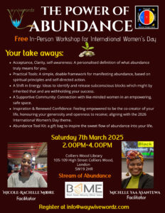 This special in-person workshop invites you to reconnect with your sacred power to manifest consistent flow of abundance in all areas of your life. We invite you to honour Women’s Month by being part of a transformative session that will inspire you to move from a mindset of lack to one of limitless flow. We will explore techniques to identify and release subconscious blocks and stubborn, self-denying beliefs that restrict your natural claim to abundance in all forms. The workshop is FREE and aimed at women in Merton who identify as Global Majority, African/Caribbean. It is held with thanks to BAME Voice and delivered by Way Wive Wordz and Education Through Culture. Register Now as spaces are limited. Light refreshments provided.